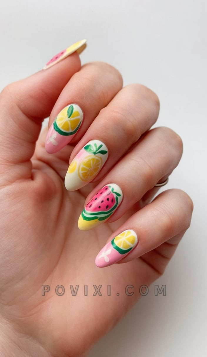 Looking at a summer market while enjoying a citrus spritzer and holding watermelon wedges is the mental image this description creates. The oval nail set presents a cheerful atmosphere. Every pastel base of this nail set becomes a beautiful little masterpiece thanks to its elegant drawings of lemons alongside pineapples and watermelon. The precise way this nail design gets layered creates an artistic style that transforms conventional fruit nails. This detailed whimsical design functions as ideal inspiration for color-loving individuals.