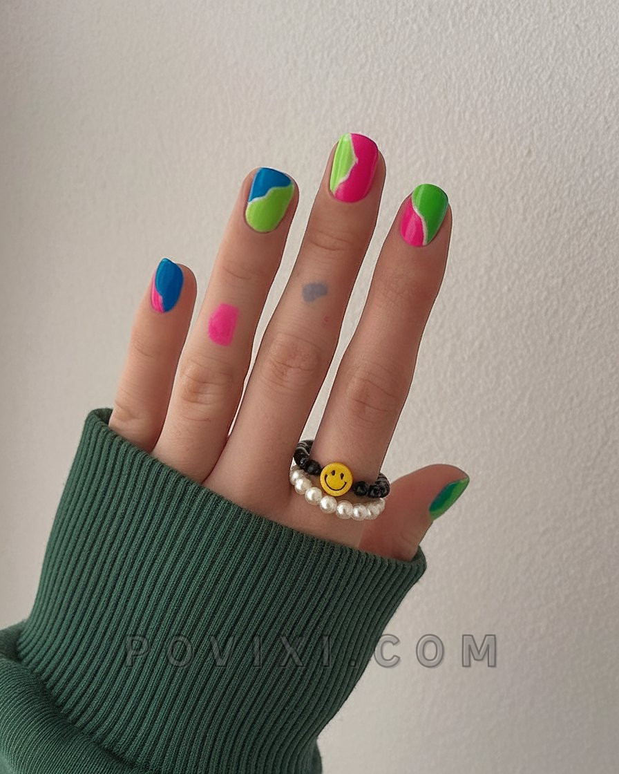 Square nails receive an electric makeover through this design method because it separates the nails diagonally in two before filling each section with vibrant neon hues. The retro ski jacket feels like it inspired these pairs of zesty colors such as chartreuse against magenta and cyan next to lime. The division between colors and smooth matte surface creates an elegant professional look. Minimalist in design but maximum impact gives this square nail style recognition as one of the leading fashion-forward choices for 2025.