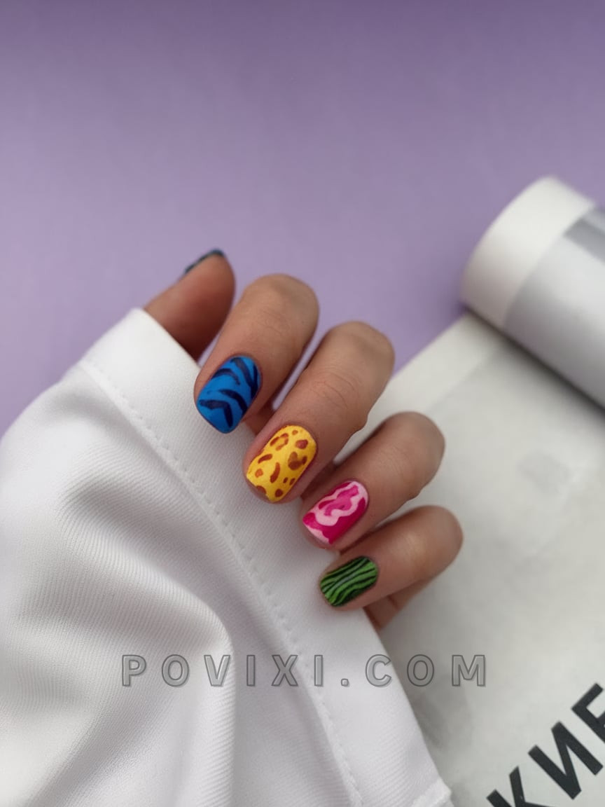 This funky summertime nail artwork decides upon a bold aesthetic. The nails have four unique designs where the first features a neon giraffe pattern followed by blue tiger design and then pink cow and lastly a textured green scale pattern. These animal patterns form an expressive safari that brings forth a unique style combination. The conflicting color scheme creates an avant-garde manicure that comes together perfectly. It’s chaos—curated.