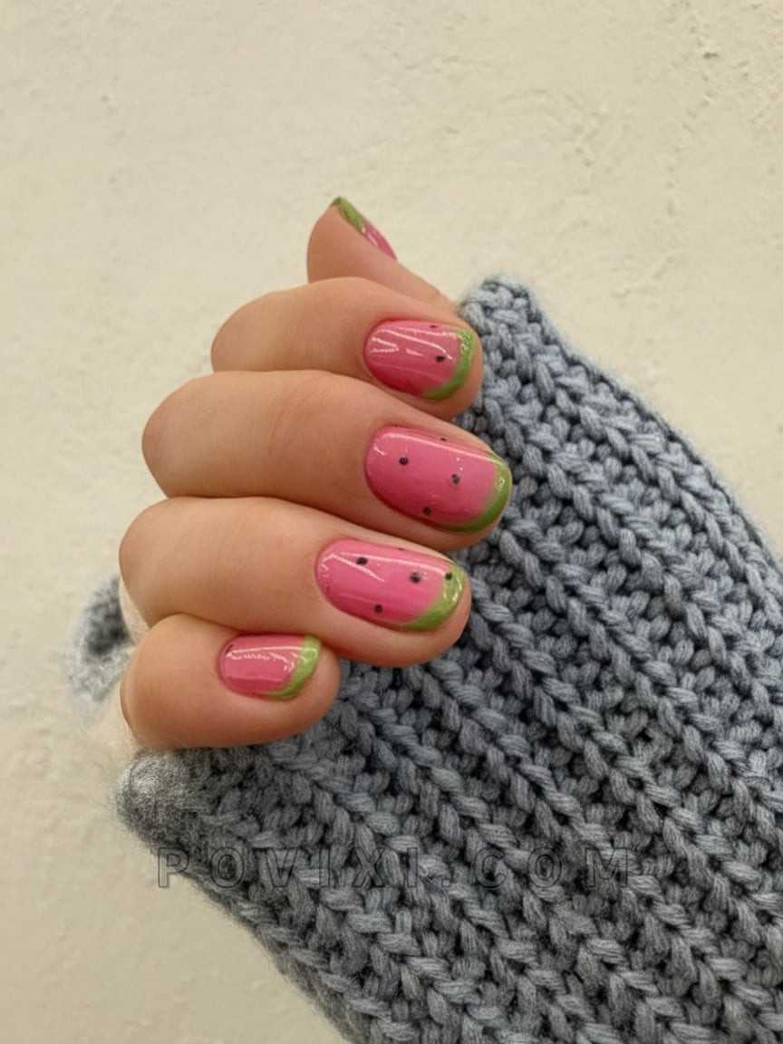 The vintage style reflects the personality of people who love fashionable designs without being self-conscious. The manicure consists of rounded short nails that first get a sheer blush polish before being finished with delicate green French tips complemented by tiny black nail seeds. The manicure represents watermelon through its simple approach. The nail design presents a wash of simplicity and freshness which delivers the same delightful charm as a top pair of jelly sandals.