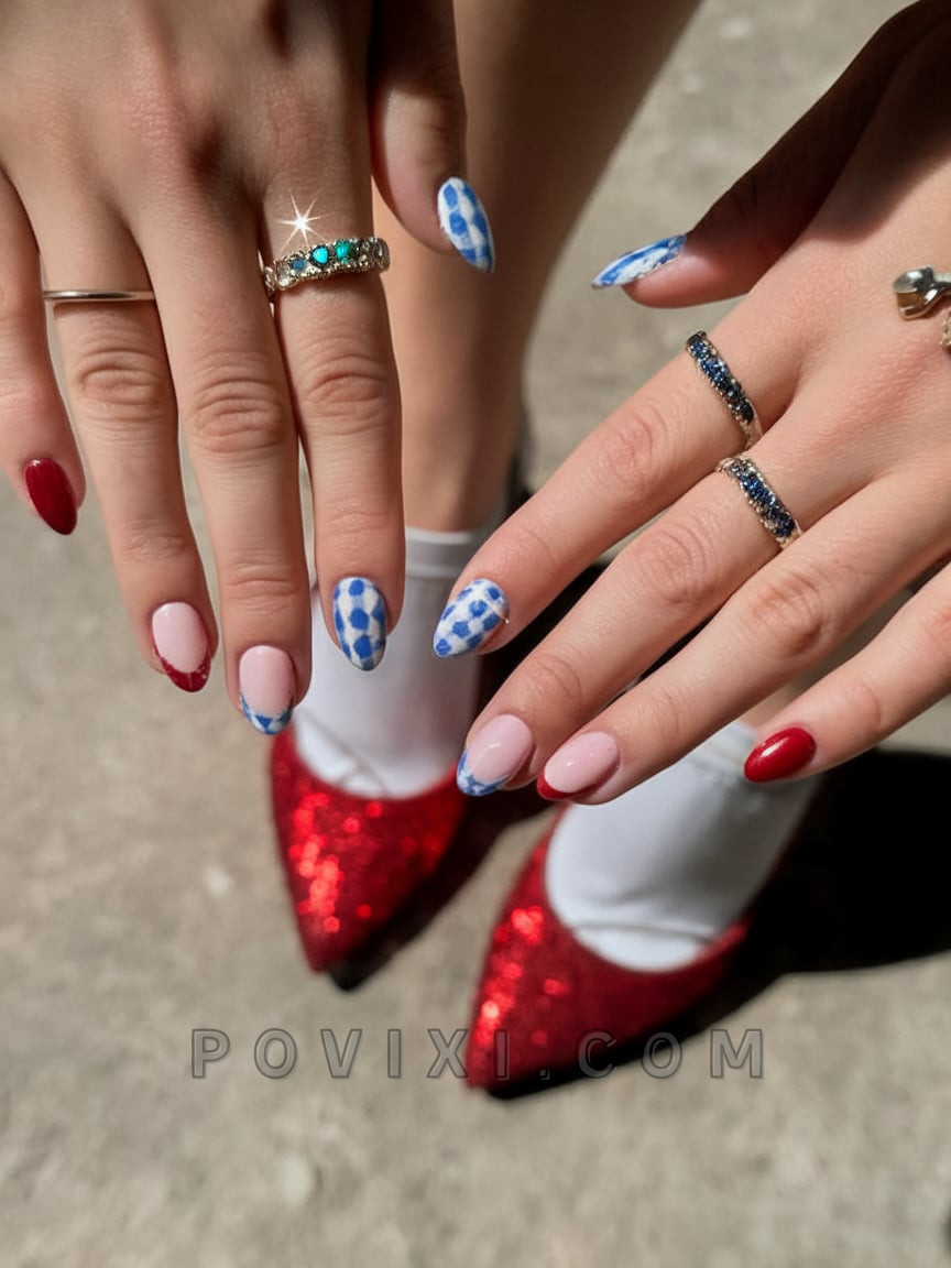 The almond nail design represents vintage picnic aesthetics through a contemporary reinterpretation of Americana charm. These nails feature a soft blue gingham decor mixed with pale nude base colors that creates a refined yet charming combination with deep red accents. This nail design serves as the perfect choice for people wanting to capture Daisy Jones style during the summer months. Cozy yet cool.
