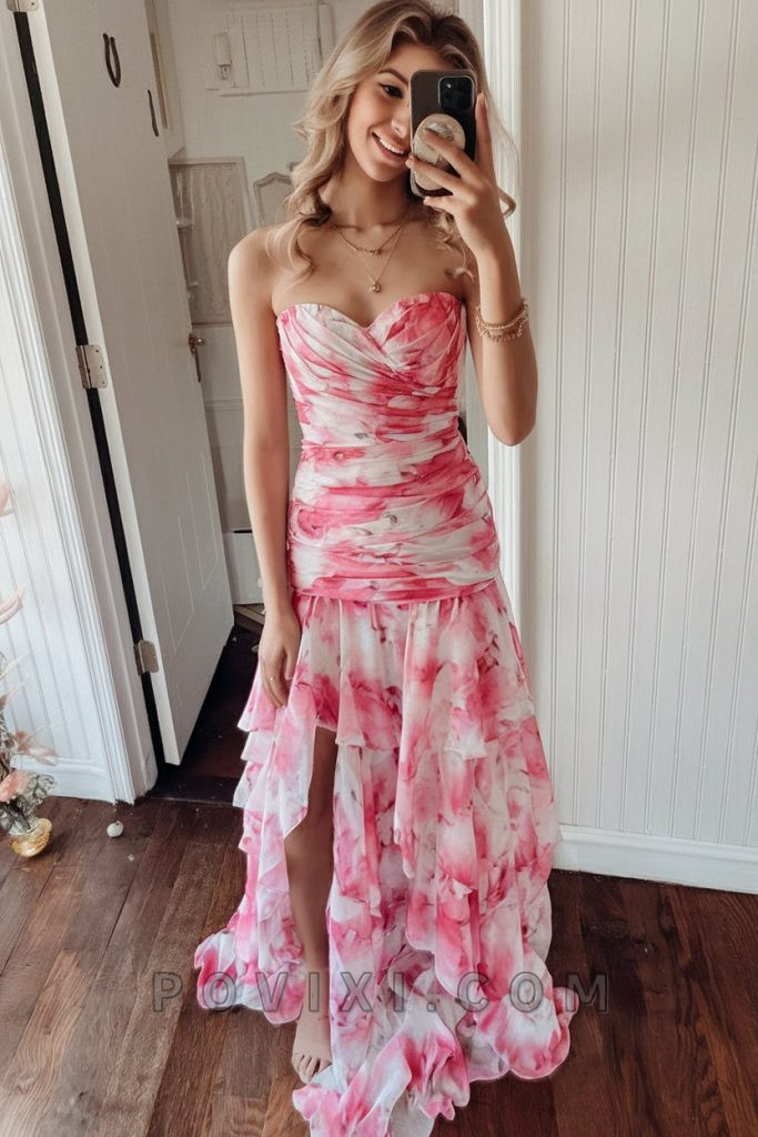 This breathtaking strapless gown is a dreamy blend of pink and white with a cascading layered skirt. The sweetheart neckline and ruched bodice create a flattering shape, while the chiffon layers add movement and elegance. Ideal for those who want a flowy yet structured look, this dress is perfect for making an entrance at any occasion. Pair this look with silver jewelry, strappy heels, and a soft curled hairstyle for a truly ethereal appearance. It’s the perfect gown for those who appreciate tulle and lace details that add texture and dimension.