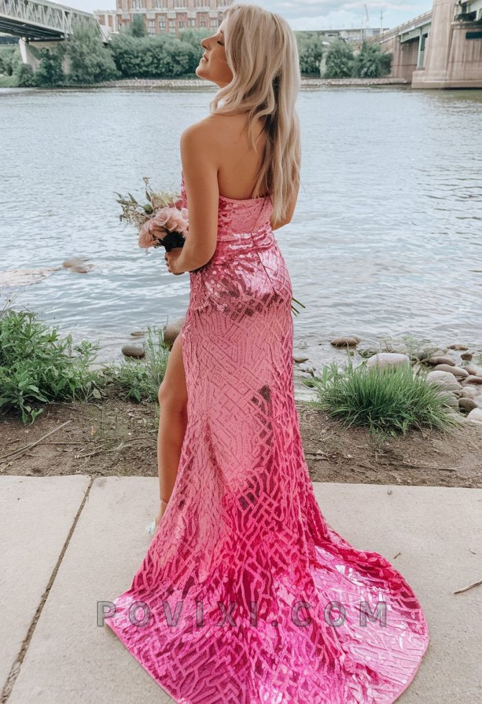 This long, figure-hugging pink gown is all about glamour. The sequined fabric catches the light effortlessly, ensuring all eyes will be on you. The subtle ombre effect adds depth to the design, and the side slit allows for ease of movement. This dress is perfect for a homecoming or even a prom event! The dramatic train makes it a show-stopping option for those who love red carpet elegance.