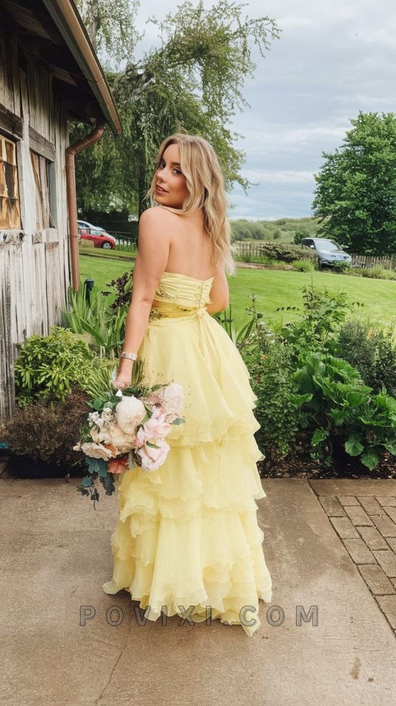 A wedding-inspired look, this flowing yellow gown radiates warmth and joy. With multiple tiers of soft chiffon, it creates a dramatic yet elegant silhouette. Ideal for a fall homecoming, this dress pairs beautifully with delicate floral accessories and soft curls. The sunshine color is perfect for making a statement while remaining effortlessly pretty and stylish.
