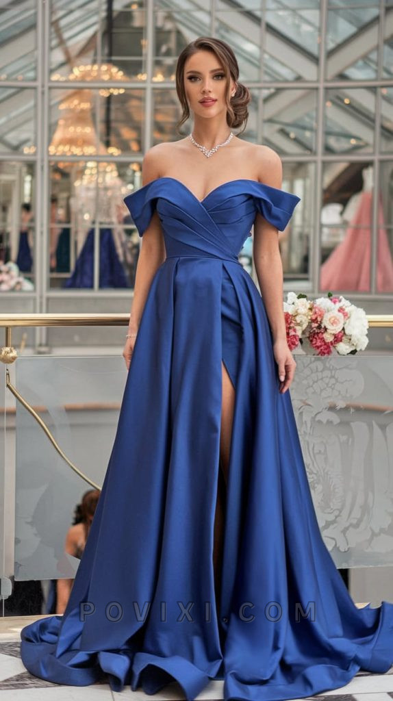 For those who want to exude confidence and sophistication, a royal blue gown is the way to go. The off-the-shoulder sweetheart neckline paired with a dramatic thigh-high slit makes this the perfect choice for someone who loves prom-style glam at homecoming. The structured satin material ensures a luxurious feel, while the flowing skirt adds movement and grace. Complement this look with silver jewelry and an elegant updo to enhance the regal vibe.