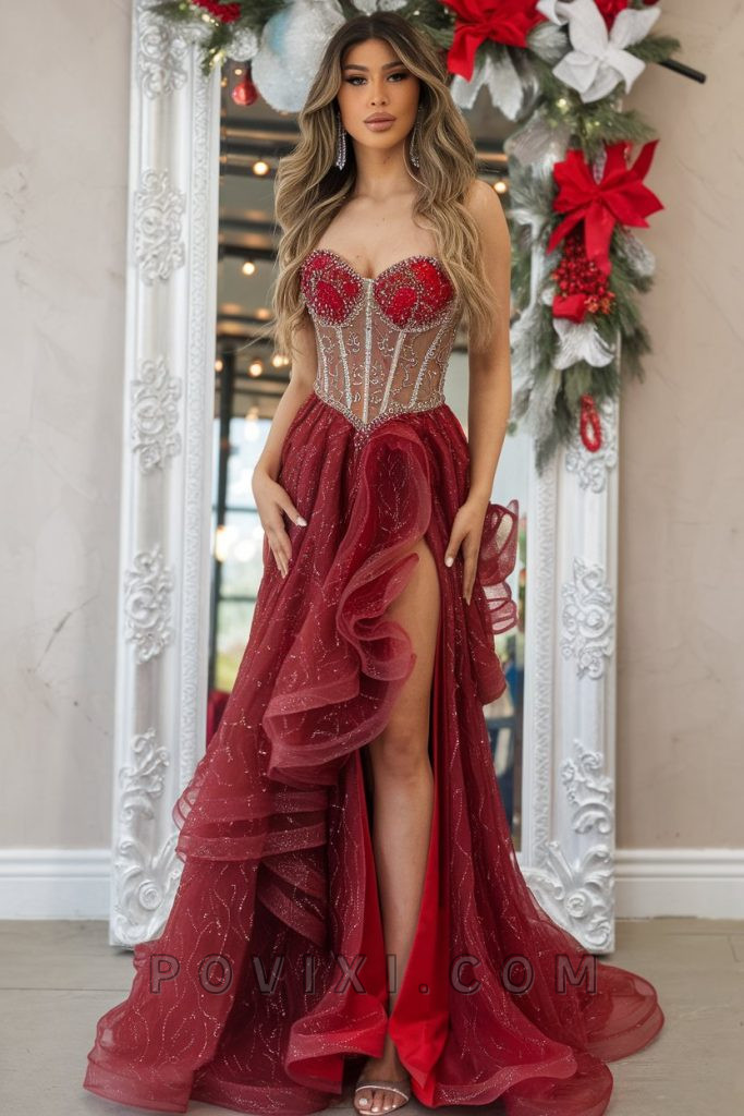 Nothing says glamour like a red gown adorned with intricate beading and a flowing tulle skirt. The structured corset bodice adds an ultra-feminine silhouette, while the high slit injects just the right amount of drama. Whether you’re attending a winter homecoming or a wedding reception, this dress is the definition of timeless elegance. To complete the look, opt for diamond studs, silver stilettos, and loose waves for a sultry yet sophisticated appearance.