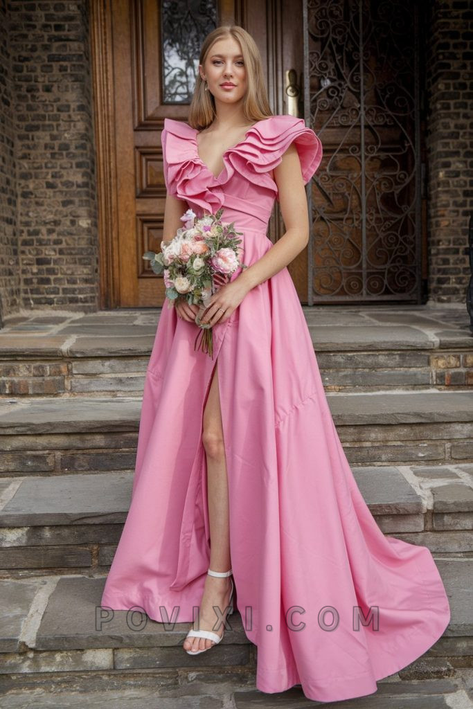 For a romantic and cute homecoming outfit, this pink dress with ruffled shoulders is the ideal pick. The cascading layers of satin create a dream-like silhouette, while the fitted waistline flatters every figure. The V-neckline gives it a classic feel, making it versatile for different occasions beyond homecoming, such as a wedding or formal dinner. Style it with a flower crown and nude pumps for a fresh, youthful look.