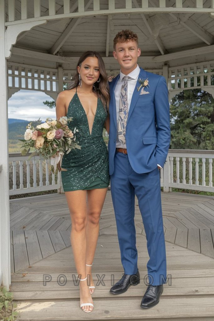 This black and blue sequined gown offers a trendy take on classic elegance. The deep V-neckline and high slit add an element of drama, while the fitted fabric flatters the body. Complete the look with strappy black heels and a bold red lip. This is the ultimate winter homecoming dress, providing both sophistication and a hint of seduction.