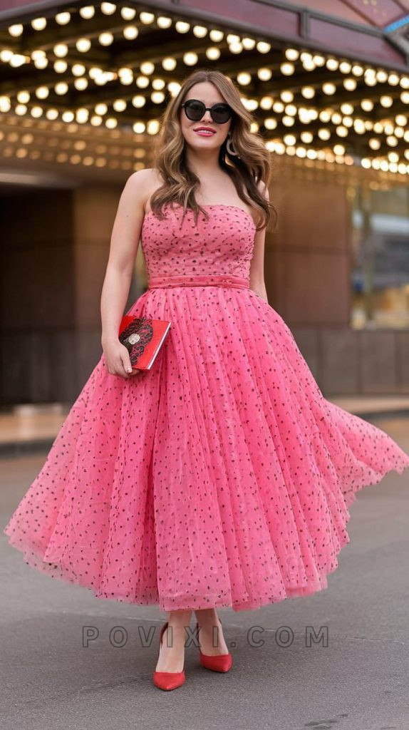 Channel old Hollywood with this pink polka dot tulle dress. The voluminous skirt and fitted bodice create a classic A-line silhouette, while the subtle print adds a playful touch. Pair with red accessories to make the look pop. A bold red lip, black heels, and retro curls would complete this vintage-inspired look, making it a timeless choice for homecoming.