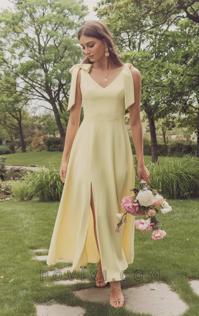 Perfect for a spring or summer homecoming, this pastel yellow dress features a flowy A-line shape with tie-shoulder details. The boat neck adds elegance, while the slit in the skirt keeps it youthful. This dress pairs beautifully with nude or gold heels, gold hoop earrings, and soft, romantic waves to embrace its feminine charm.