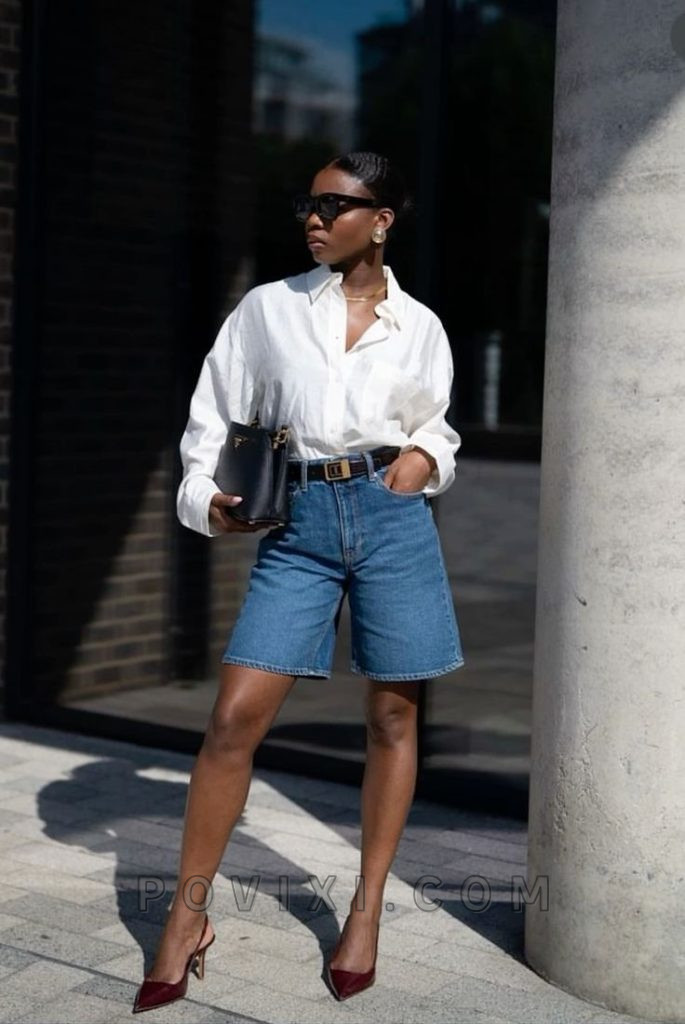 Summer business casual doesn’t always have to mean skirts or dresses. This jeans-inspired shorts look brings a fresh take on women work attire by balancing professionalism with modern styling. This ensemble is perfect for women style inspiration looking to experiment with shorts for work while maintaining an air of sophistication.