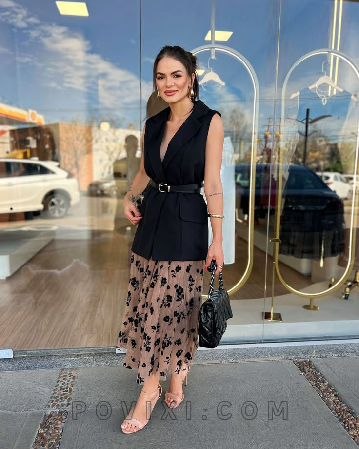 For those who love a mix of skirts and structured elements, this outfit blends a soft, flowy tulle skirt with a sleek black vest. The cinched waist adds definition, while the soft heels make it an elegant yet practical choice for work attire. Add pearl earrings or a delicate bracelet to give the outfit an extra dose of femininity.