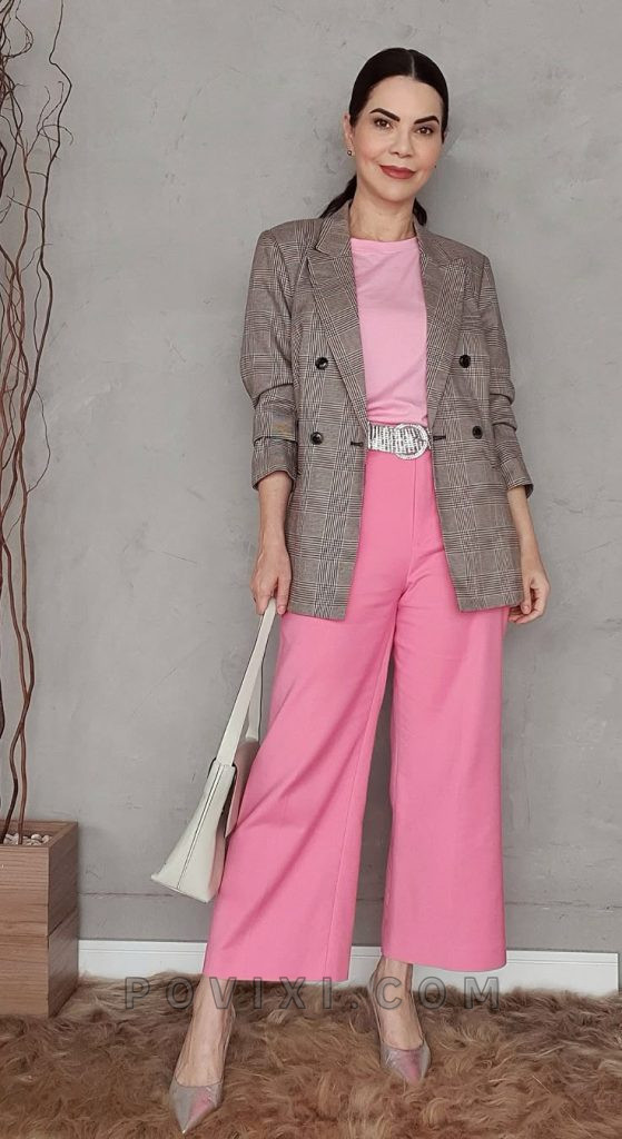 Pink is making a statement in 2025, and a midsize pink suit is an excellent way to introduce color into your work attire while keeping things professional. This look pairs wide-leg cropped pants with a soft pink blouse, topped off with a plaid blazer for a refined finish. The ensemble is completed with neutral-toned pumps and a structured handbag, making it perfect for women over 50 who want to add a playful touch to their business casual wardrobe.