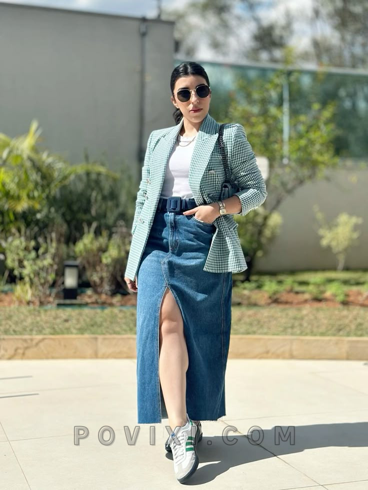 A denim midi skirt with a slit front is the ultimate mix of casual and professional. Paired with a fitted white tee and a gingham blazer, this look is both structured and relaxed. The addition of tennis shoes keeps it fresh and comfortable, making it ideal for women who are on the go and want women work attire that transitions easily between meetings and casual outings.