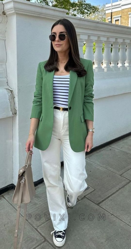 A young professional work clothes essential, this look exudes confidence while remaining summer-ready. The structured green blazer adds a pop of color to a classic black-and-white striped top, making it perfect for work. The white jeans offer a fresh and modern contrast, elevating the entire ensemble. Paired with sneakers, this outfit keeps things professional yet effortless—ideal for casual Fridays or creative office environments. Swap the sneakers for loafers if your workplace leans more formal.