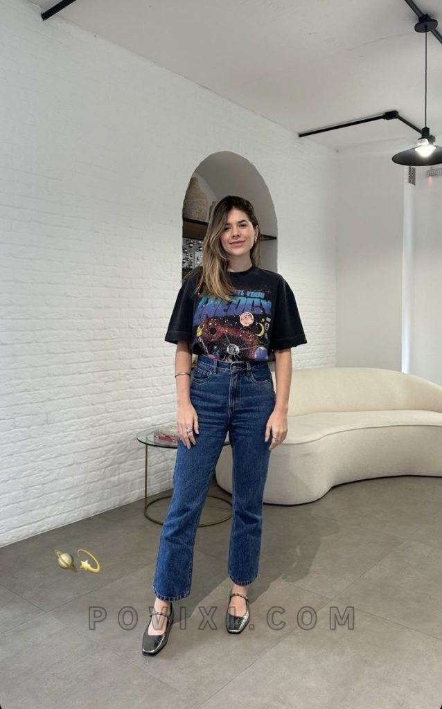 Business casual doesn’t always have to mean stiff blouses and blazers. This outfit proves that a graphic tee, when paired with high-waisted jeans and sleek ballet flats, can be stylishly appropriate for work. The structured jeans keep the look polished, making it a great choice for women work attire in creative fields. To make it even more office-ready, throw on a tailored blazer and add a minimalist leather tote.