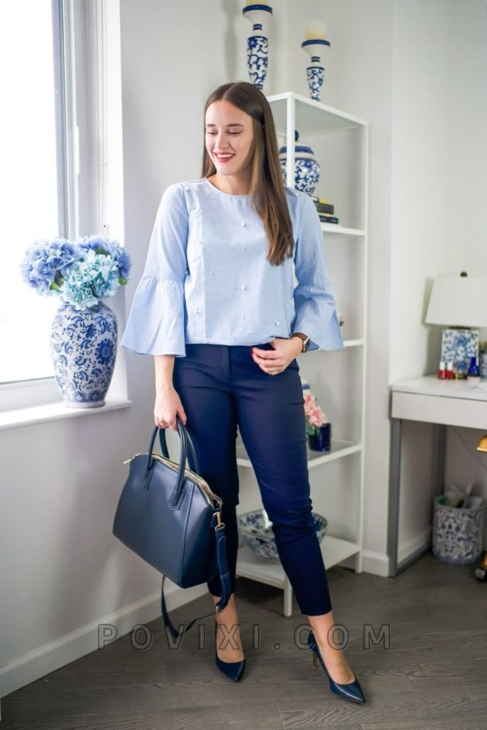 For those looking for work attire classy black pants, this outfit is a must-have. The light blue blouse features delicate embellishments and voluminous sleeves, adding a touch of femininity to structured black pants. The navy heels and handbag complete the monochrome aesthetic, making this an excellent choice for women who want to maintain a refined, put-together look. Perfect for corporate settings, this style blends structure with soft elegance.