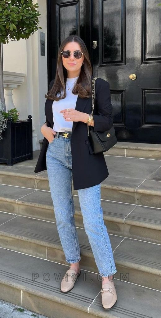 This women work attire look is a timeless classic. The black blazer is the hero piece, instantly upgrading a simple white tee and vintage blue jeans. The neutral-toned loafers make this ensemble effortlessly chic, great for both formal and casual work settings. This outfit is a go-to for women over 50 and young professionals alike, proving that classic style never fades.