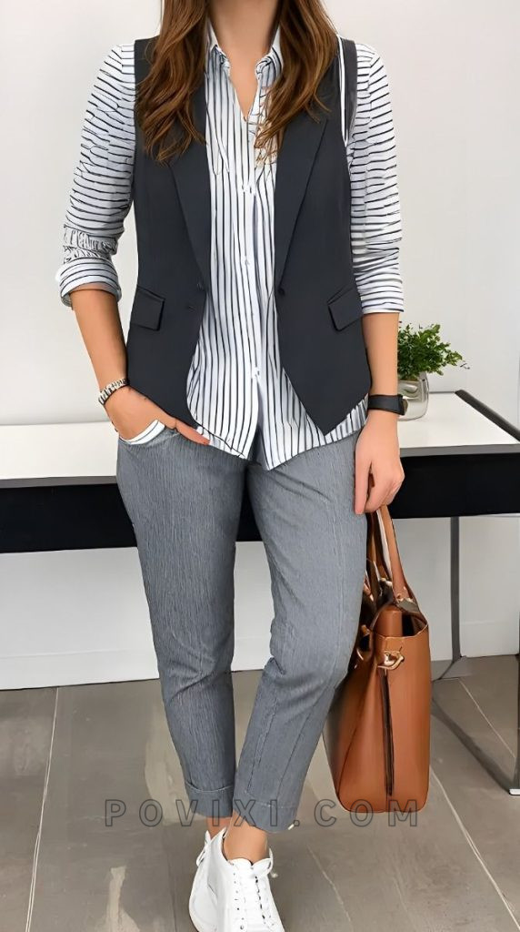 For an effortlessly cool and modern take on business casual, pair a structured black vest over a vertically striped button-up. Styled with gray trousers and sneakers, this is perfect for young professionals or those in creative industries. Tennis shoes make the outfit ideal for commuting in comfort. Add a leather backpack or structured tote to keep the look functional and stylish.