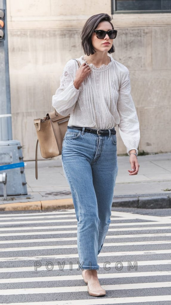 Timeless and European-inspired, this look pairs high-waisted jeans with a delicate white blouse featuring intricate lace detailing. A neutral handbag and ballet flats complete the modest yet elegant look, perfect for a casual stroll or a workday in the city. This outfit is a staple for anyone seeking street style casual that blends femininity with structure. To add a bit more contrast, swap ballet flats for chunky sneakers or sleek loafers, making it adaptable for both day and night looks.