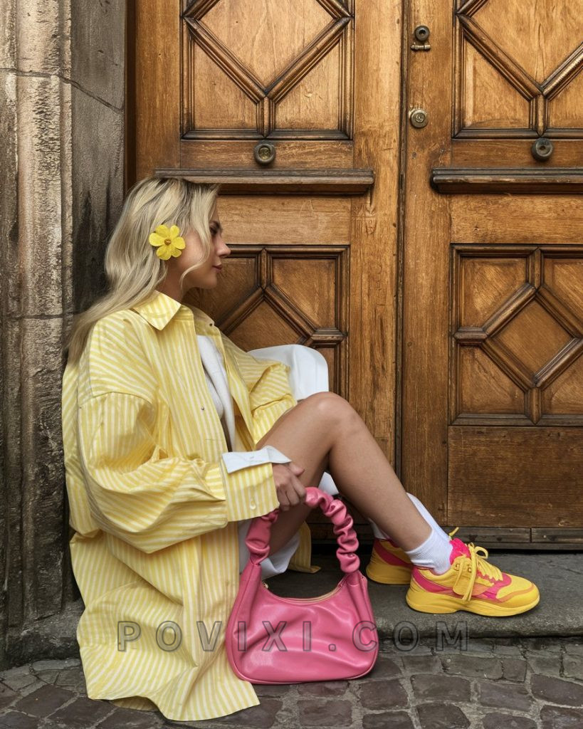 This Euro-inspired outfit blends street style casual with a touch of boldness. The oversized yellow striped shirt pairs effortlessly with white sneakers and a cute pink ruched handbag. A perfect outfit for a midsize fashionista embracing vibrant summer colors while keeping things laid-back. If you’re looking to make it more NYC-friendly, throw on a pair of statement sunglasses and swap sneakers for trendy platform sandals to add a sophisticated edge.