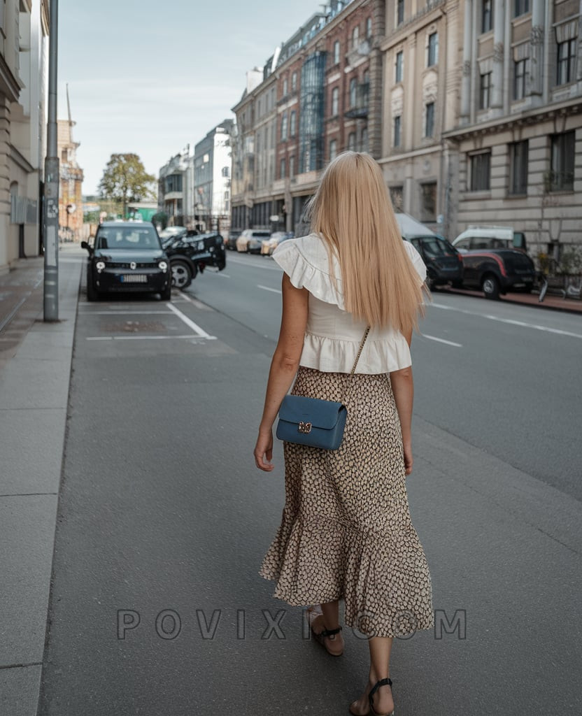 This romantic, late-summer inspo look features a ruffled white crop top and a flowy printed midi skirt. A structured blue handbag adds a touch of elegance, making it a money-worthy outfit for stylish women who prefer modest yet trendy summer wear. To elevate the outfit further, add statement earrings and a chic hair accessory like a silk scarf or pearl hair clips, completing a soft yet sophisticated aesthetic.