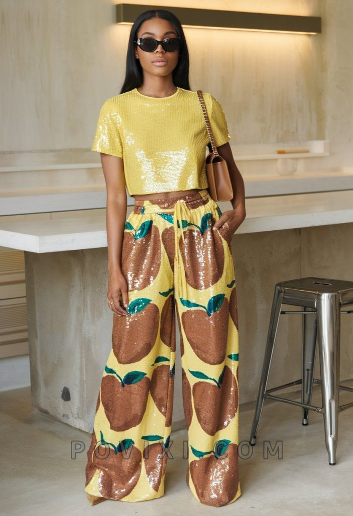 For those who love going out and making a bold statement, this head-turning outfit features a yellow sequined crop top and matching wide-leg pants with oversized fruit embellishments. It’s a fresh take on street style 2025 with a luxury twist. If you want to make it a bit more wearable, style the sequined top with high-waisted white trousers or wear the bold pants with a neutral tank top to let the statement piece shine without overwhelming the look.