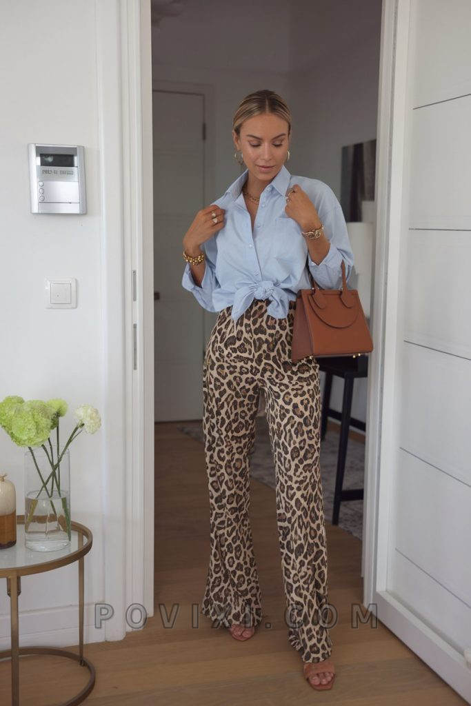 Channeling a boss-lady vibe, this ensemble features a crisp oversized blue button-down knotted at the waist, paired with bold leopard-print trousers. The contrast between classic tailoring and wild patterns makes this a hot 2025 trend for women who love going out in confidence. Gold accessories add a polished touch, making it an ideal night look for rooftop cocktails. For a more modest take, swap the crop top for a fitted tank and keep the oversized shirt open like a breezy outer layer.