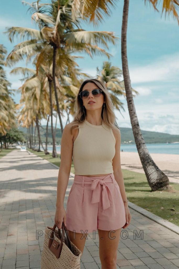 Nothing says hot summer inspo like an outfit that seamlessly transitions from a coastal walk to an urban café. This look features a ribbed, sleeveless top paired with high-waisted, pastel pink shorts, cinched at the waist with a soft tie. The lightweight fabric makes it perfect for a casual day under the sun, while the neutral tones keep it effortlessly stylish. Paired with a woven tote and oversized sunglasses, this ensemble is a staple for anyone embracing street style 2025 with a feminine touch. Style tip: Swap sandals for sleek white sneakers for a more European city vibe.