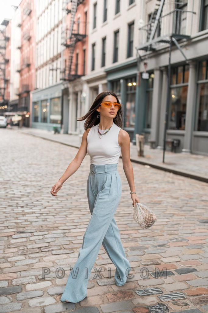 For the ultimate street style casual aesthetic, this outfit delivers. High-waisted, powder-blue trousers elongate the legs, while a crisp white sleeveless top balances the structured silhouette. The addition of modest yet statement accessories—orange-tinted sunglasses and a woven bag—adds a Euro-inspired retro feel. Whether you’re stepping out for a coffee run or heading to a rooftop brunch, this ensemble is an effortless blend of midsize elegance and modern minimalism. Try layering delicate jewelry for a more polished finish.