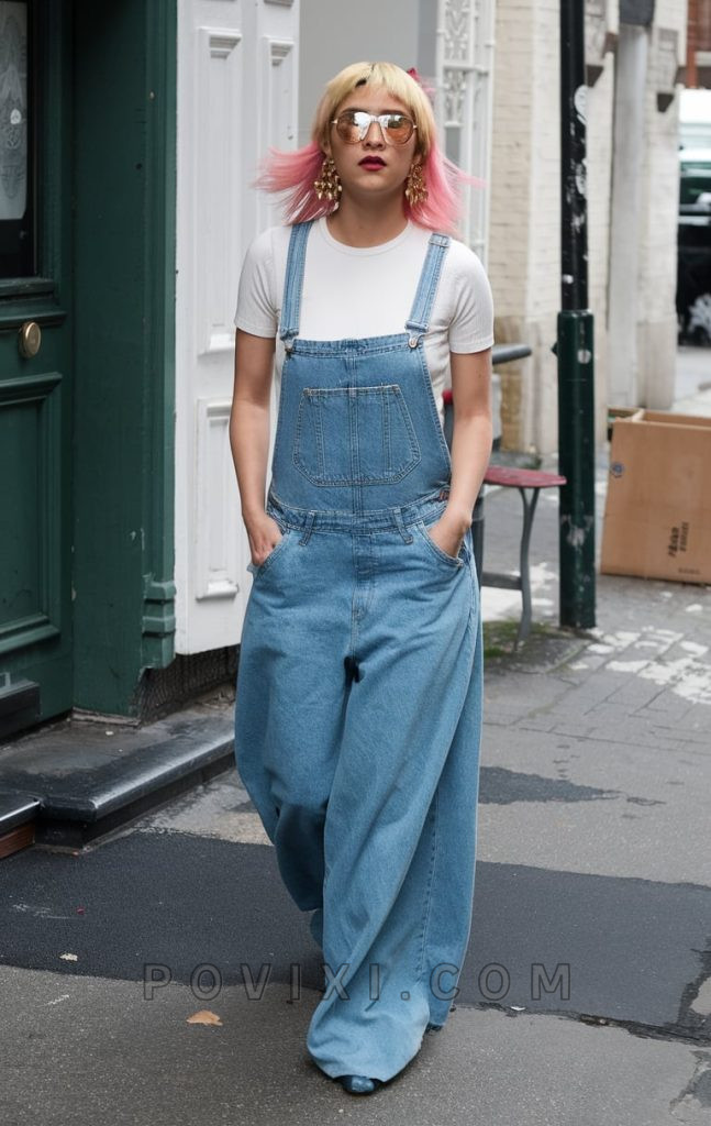 Overalls are making a serious comeback in 2025, and this outfit proves just how stylish they can be. A fitted white tee provides the perfect base for these wide-leg denim overalls, which exude a relaxed European street style. The oversized sunglasses and pink-tinted hair add a bold, playful touch, making this look a cute and hot option for creative city dwellers. To elevate the outfit for an aesthetic night out, swap sneakers for platform sandals and add a structured blazer.