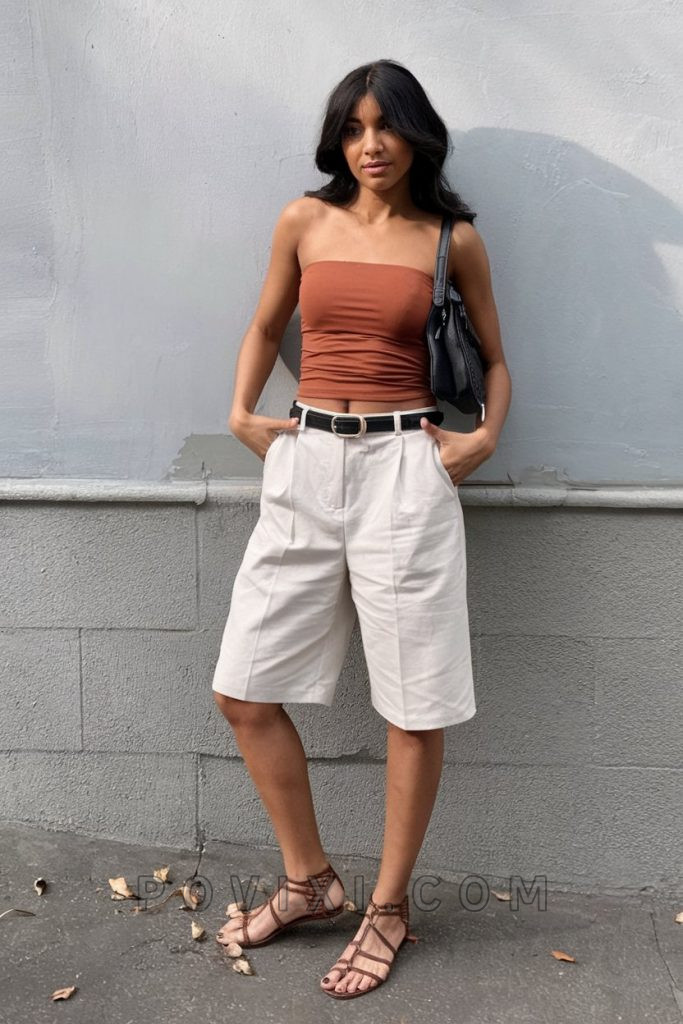 Sometimes, less is more. This casual, late-summer outfit blends muted tones with sharp tailoring, featuring a fitted brown tube top paired with knee-length cream shorts. The black belt and structured handbag give the outfit a modern edge, perfect for those who love NYC street style with a refined twist. Strappy sandals add a European touch, while the minimalist aesthetic keeps it polished. For an evening look, throw on a cropped blazer and switch to heeled mules.
