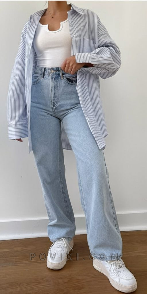Nothing says street style 2025 quite like an oversized striped button-down over a crisp white tank and high-waisted jeans. The loose fit keeps it breathable, while chunky white sneakers add a casual yet stylish feel. Perfect for running errands or grabbing coffee in the city. Roll up the sleeves for a more structured, polished effect. Add layered necklaces for a cute and effortless touch.