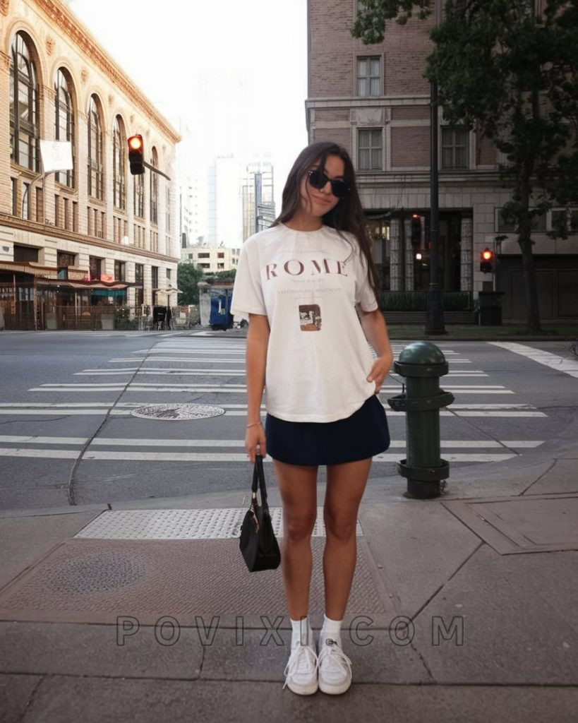A printed oversized tee tucked into a dark mini skirt, paired with sporty white sneakers and socks. The relaxed silhouette makes it a must-have inspo for a casual weekend out in NYC or exploring a new city on foot. Add an oversized blazer for a money look that transitions seamlessly from casual to polished.