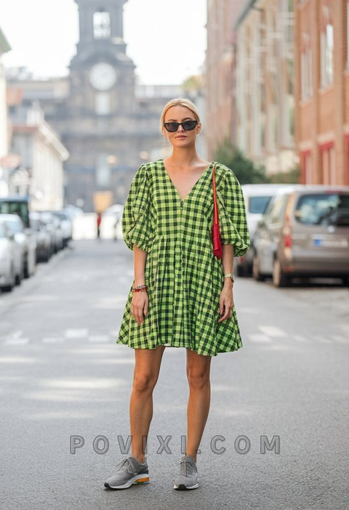 A puff-sleeved Euro-inspired gingham dress is the definition of effortless city chic. Styled with trendy gray sneakers and a bold red handbag, this outfit is ideal for sightseeing or brunch with friends. Swap the sneakers for espadrille wedges for a more elevated European summer look.