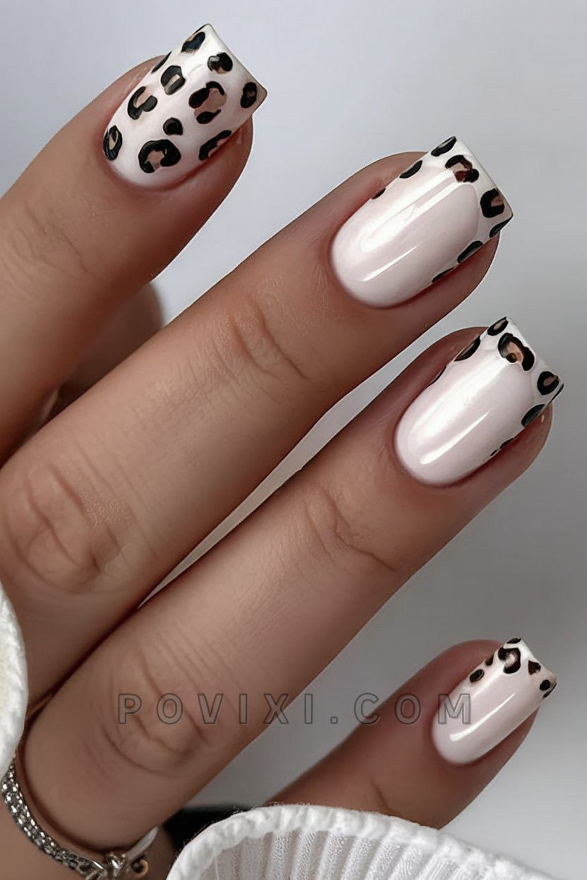 This creative nail design combines French tips and animal elements in an original way. Neutral peach polish creates a smooth base for black and brown leopard patterns to wrap around the nail tips. The square shape makes this style edgy yet sophisticated. This design ensemble maintains its style power in both professional work environments and evening city nightlife events. Simple or neutral clothing that accentuates the nails should be paired with minimalist jewelry.