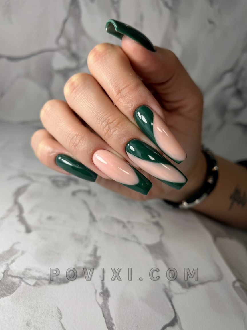 A coffin-shaped acrylic design features deep green waves over a nude base. This design combines boldness with subtlety through its 2025 art style that maintains straightforwardness. The long coffin shape creates a lengthening effect on the hands along with an attractive atmosphere perfect for oceanfront gatherings at nightfall. Complete the modern look with gold rings and stackable accessories.