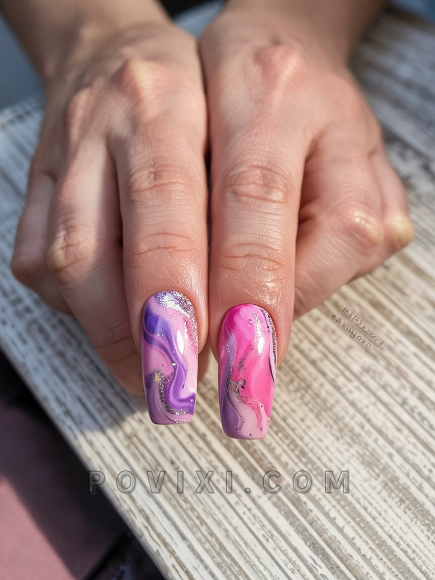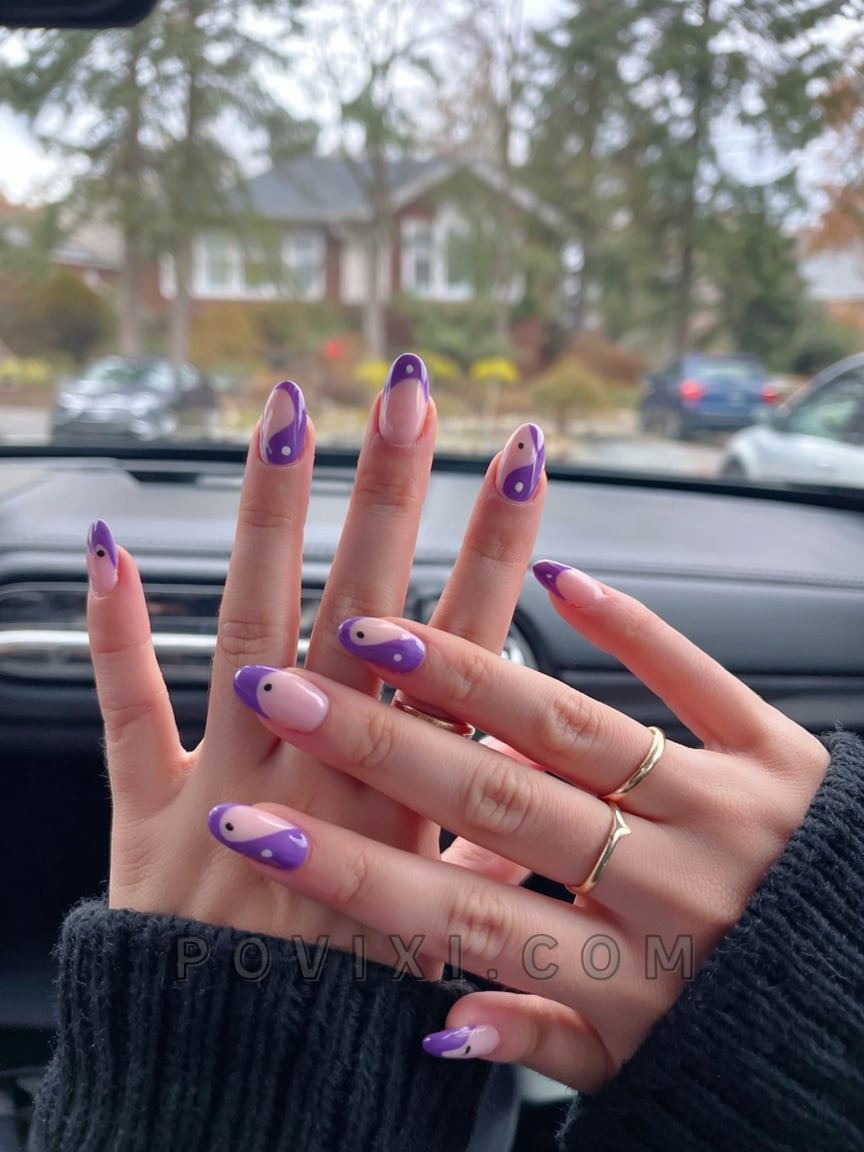 A contemporary take on the traditional yin-yang design is presented to Gen Z in this rendition. These almond-shaped nails feature circular yin-yang motifs in reverse color blocks between purple and pink spaces, creating fluid curves between them. This style exudes the true essence of 2025 through its bold colorful features and totally free, playful character. This nail design works best for festive occasions and brings a mix of bold creativity and balance with its glitter accents.