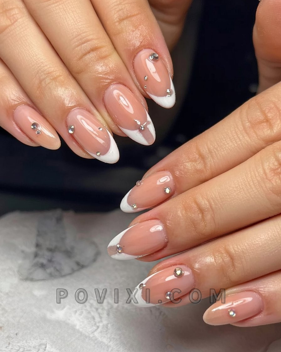 White enamel nails take on a space-age sophistication with celestial design elements. Beautiful almond-shaped nails carry delicate gold stars, crystals and pearls that perfectly line the polished nude surface. A rejuvenated and refined version of the French manicure appears with otherworldly charm. In 2025, the style remains timeless yet modern, creating an elegant look that suits all skin types for weddings, garden parties and upscale brunches.