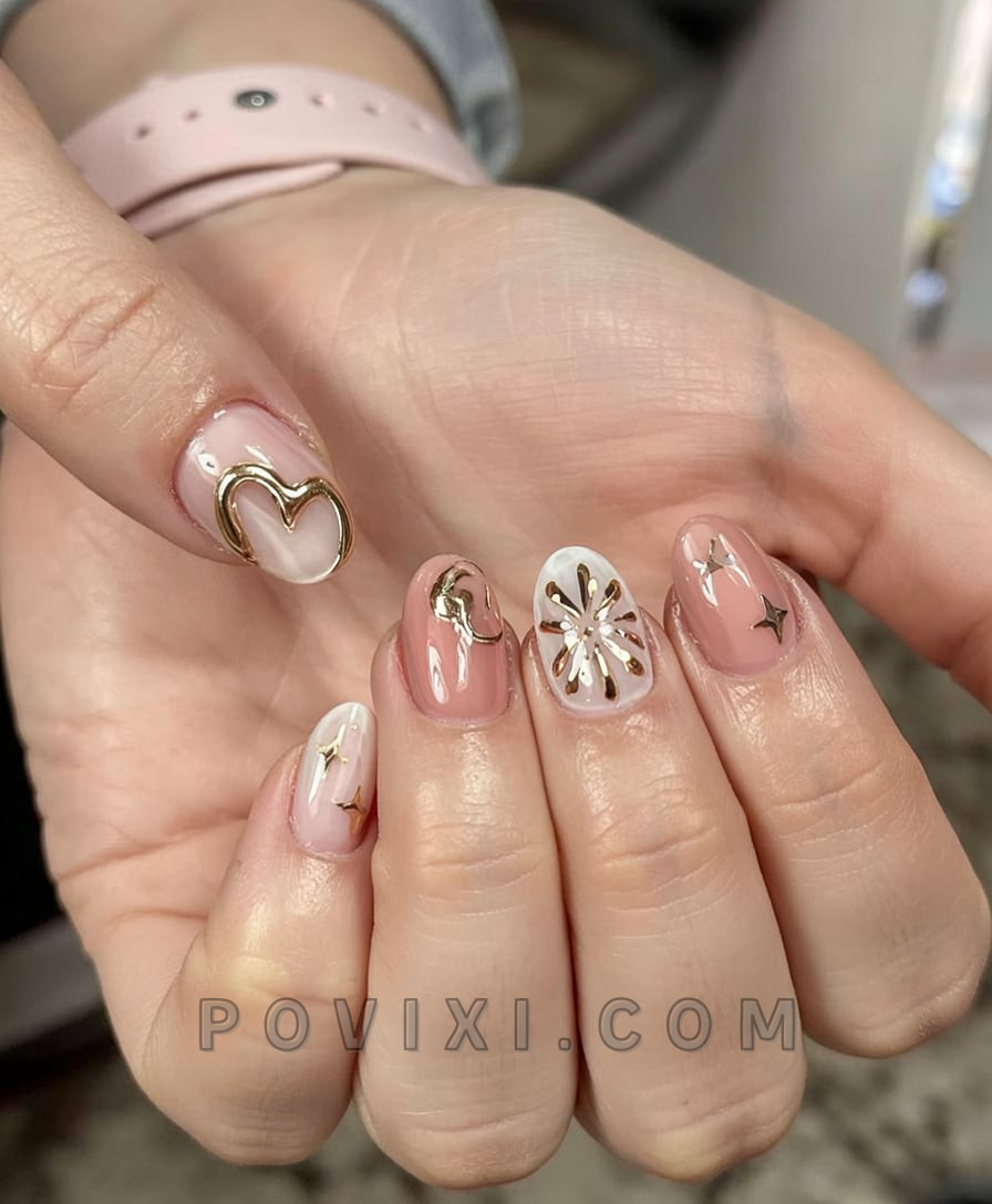 Fast rounded nails present an astrology-inspired design that embodies contemporary fashion trends. Metallic gold shapes with moons, hearts along with stars sit on a soft pink background to create a mystical feminine look. This stylish manicure blends boho fashion with luxury aesthetics and complements contemporary outfits that combine modern sophistication with spiritual elegance. For the right look, wear stacked rings and moonstone jewelry as accessories to enhance the glow.