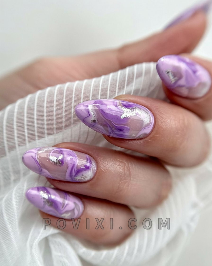 This almond-shaped set features lilac clouds dancing across its design, creating a summer sky feel when you place your fingertips inside. The serene, sweet overall look comes from the milky-white and purple mix with subtle shimmer effects. The uncomplicated yet sophisticated nail style is perfect for relaxing days at the beach and weekends in floaty dresses.