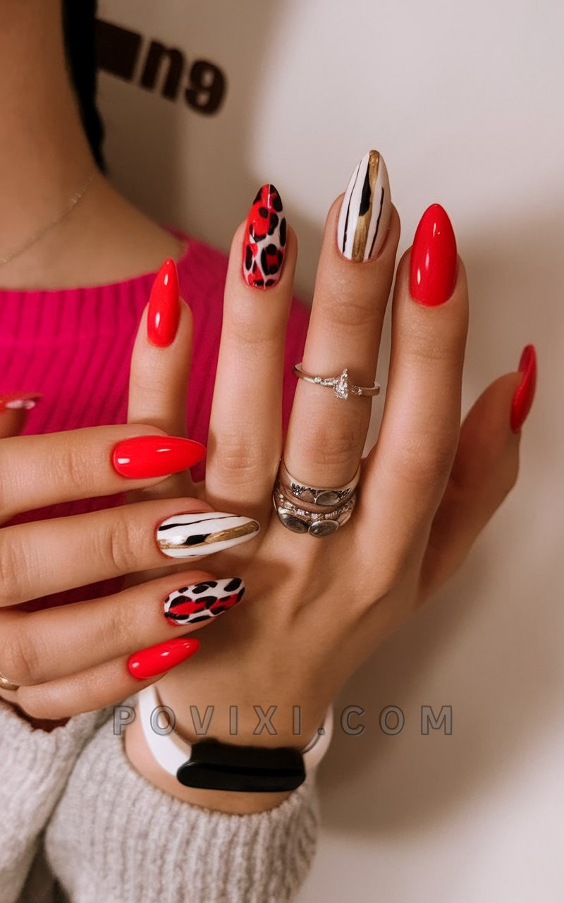 These nails combine airbrushed artwork with vibrant solid colors. The 2025 almond nail design uses pink marbled surfaces paired with neon glossy ends that highlight the beauty of the hand. These nails epitomize trendy boldness as they combine holiday sophistication with streetwear spirit to create an ideal choice for fashion-forward personalities. Pair hot pink sweatpants with these ribbed tank tops.