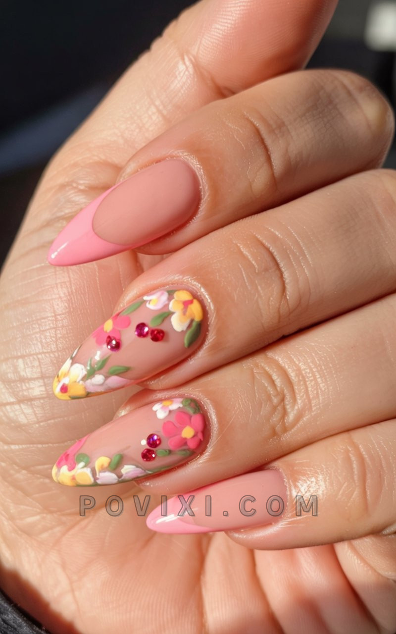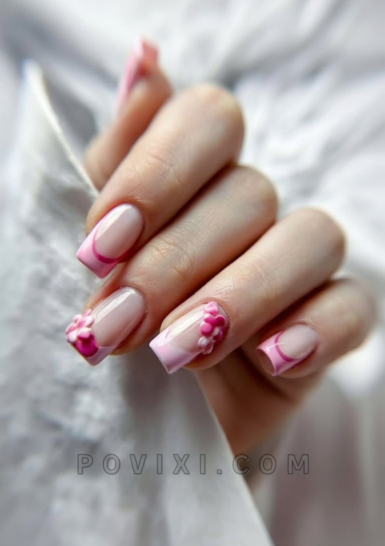Acrylic nails with these floral designs bring us back to the feminine side of life by presenting us with sophistication. Soft pink tips feature elegant 3D floral applications of fuchsia and pastel pink petals. These sharp nails define an elegant summer style. The short and sweet square nail design is perfect for summer weddings and brunch venues, as well as cute cafes when you need photos for social media. The aesthetically pleasing textures make this manicure feel like it belongs on a runway.
