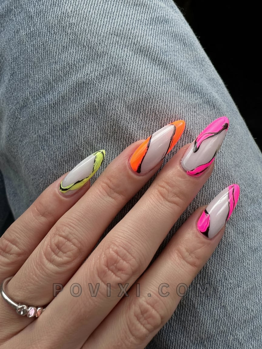 An edgy nail design scatters vibrant neon pink, orange and yellow slashes across a muted nude background. The graffiti-style black outlines and polka dots transform this piece into wearable art for its artistic design elements. These rebellious yet sophisticated nails with almond shapes and matte finish work well at concerts or with denim outfits for a distinctive color scheme.