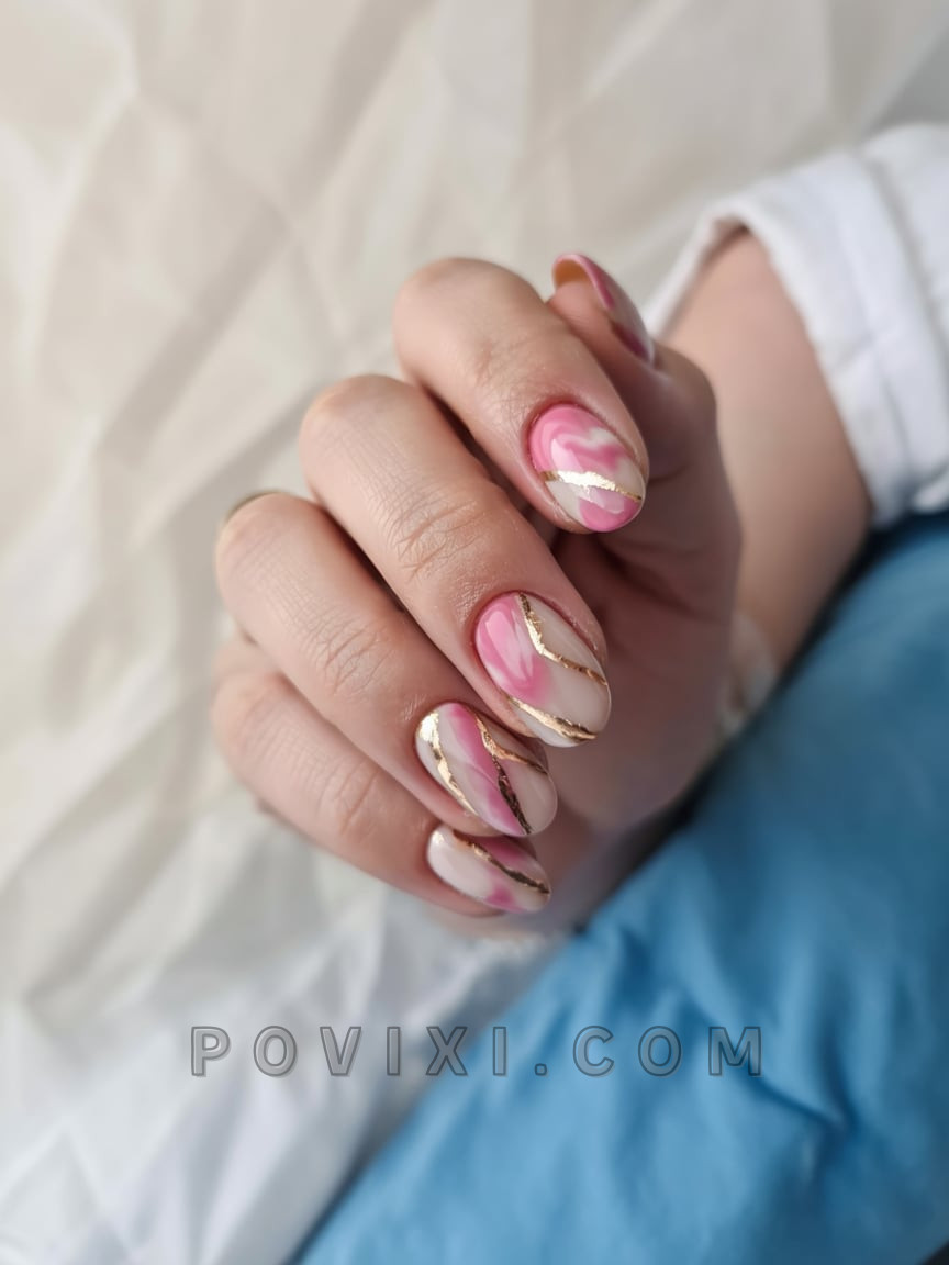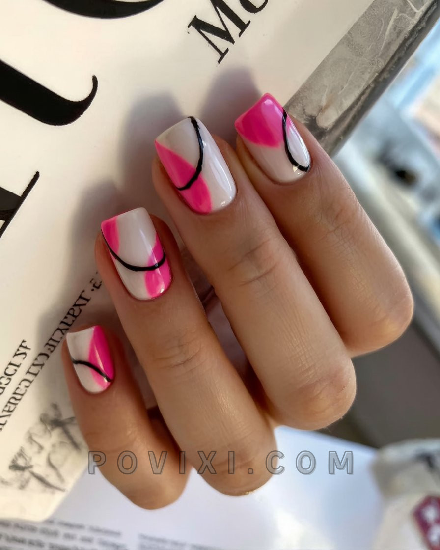 The square nail design uses short dimensions to show natural transitions of beige with gold lines that carry hot pink tones. A modern take on retro swirls creates this design that fits the casual-cool style of 2025. This bold nail style works well with linen sets, loafers and summer blazers, offering style and versatility as a polished whole.