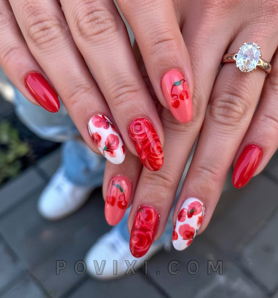 A fruity-fresh delight! The manicure features almond-shaped nails that present both_negative_ space and complete floral design with vibrant cherry patterns. The manicure exudes sunny happiness through its bright yellow daisies alongside the green foliage that decorates it. This nail design is perfect for any occasion, from dining al fresco to cross-country driving and sunbathing. The manicure has adorable features while remaining perfect for social media photos.