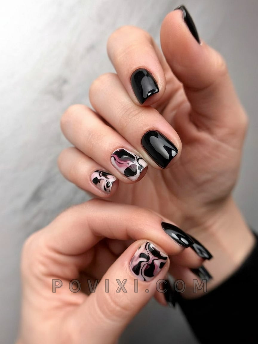 The design features solid black power and minimalist details in harmony. The focus of these nails is a deep black high-gloss polish that creates a stunning blend of elegance and edge. A highlight of this design is the black, pink and beige floral painting on a blank nail for an artistic and whimsical effect. The almond-shaped nails offer versatility by toning down the fierceness while maintaining professional appeal throughout the day and evening. This nail design is for women who want to express their individuality with a 2025 upscale style.