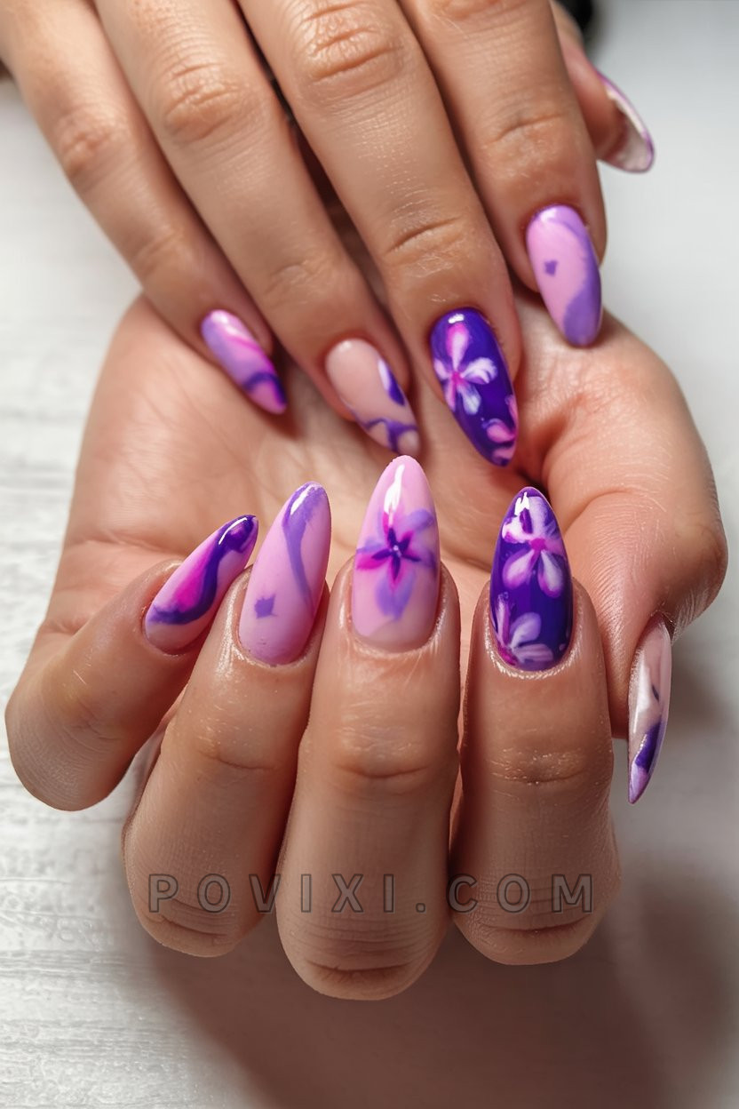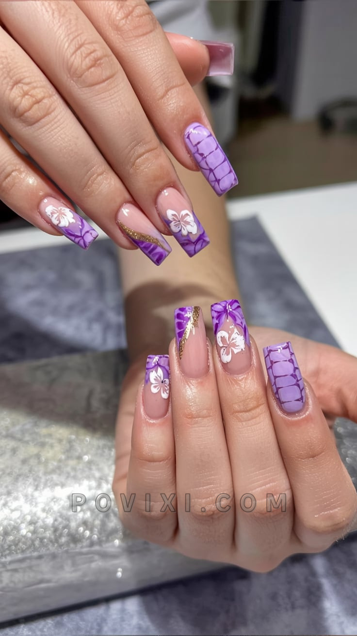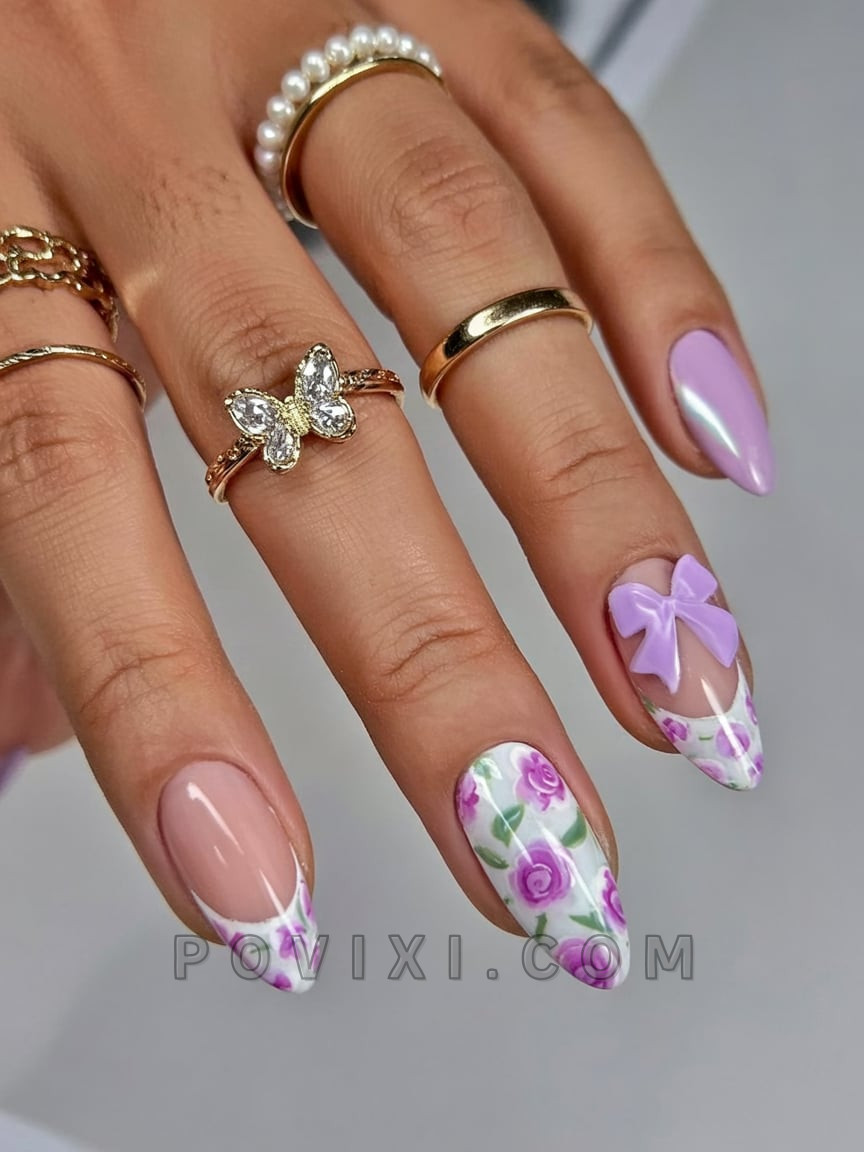 Oval and almond-shaped nails are flirtatiously pretty when adorned with hand-drawn purple roses complemented by precious bows. The nail art has romantic qualities that remind me of old-fashioned summer garden parties. This statement features two distinct color elements that create a delicate and expressive balanced look through the contrast between the nude base and the lavender floral details. The style works best for soft-girl fashion and relaxed summer gatherings.