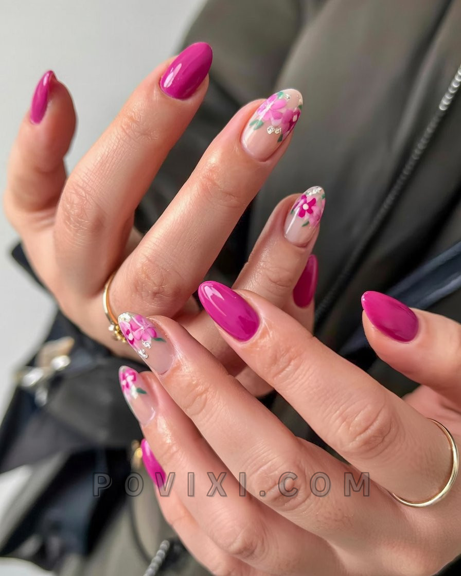There’s something eternally fun and flirty about magenta. Bold pink dominates the scene with its powerful appearance combined with soft daisy-like petals that appear on transparent tips. This short-length, oval-shaped hairstyle offers everyday convenience along with colorful flair. The decorative floral elements in this design suggest relaxed summer activities, such as sitting in outdoor restaurants or exploring weekend market stalls. A nod to femininity with just the right amount of playfulness.