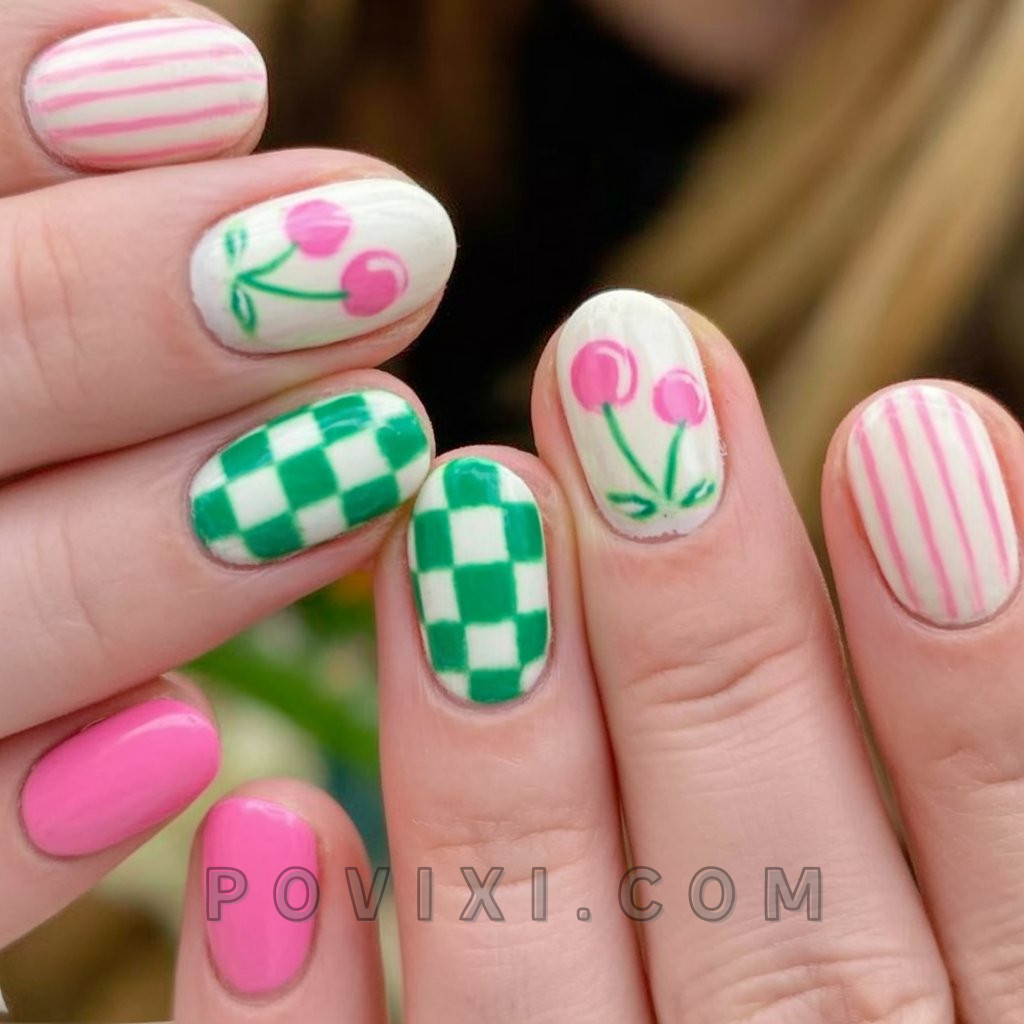 The nails here feature bold red cherries next to gingham patterns and blooming flowers for an energetic picnic style. The oval-shaped nails present a sweet summer vibe with their bright artwork that turns each nail into a petite work of art. These nails would be perfect paired with crop tops and retro sunglasses for a playful, flirty weekend ensemble.